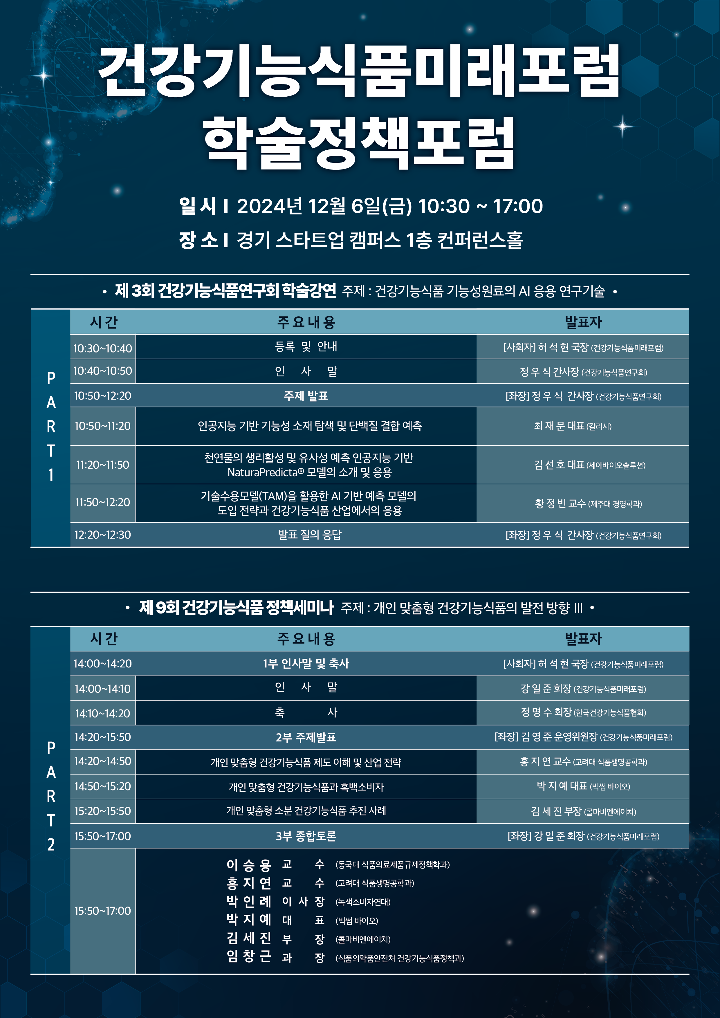❍ 일 시 : 2024. 12. 6 (금) 10:30 ~ 17:00 ❍ 장 소 : 경기 스타트업캠퍼스 1층 컨퍼런스홀 ❍ 주 최 : 건강기능식품미래포럼 / 건강기능식품연구회 ❍ 후 원 : 한국건강기능식품협회 ❍ 일 정  ❍ 사전등록 : 2024년 12월 5일 (목) 23시까지 온라인 신청 ( 클릭 / 선착순 300명)