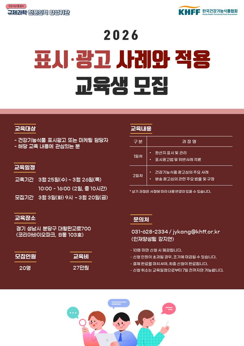 우리 협회에서는 건강기능식품 산업계의 인재양성을 위한「표시ㆍ광고 사례와 적용 교육생 모집 안내」을 개설하여 다음과 같이 교육생을 모집하오니 많은 관심 및 신청 바랍니다.