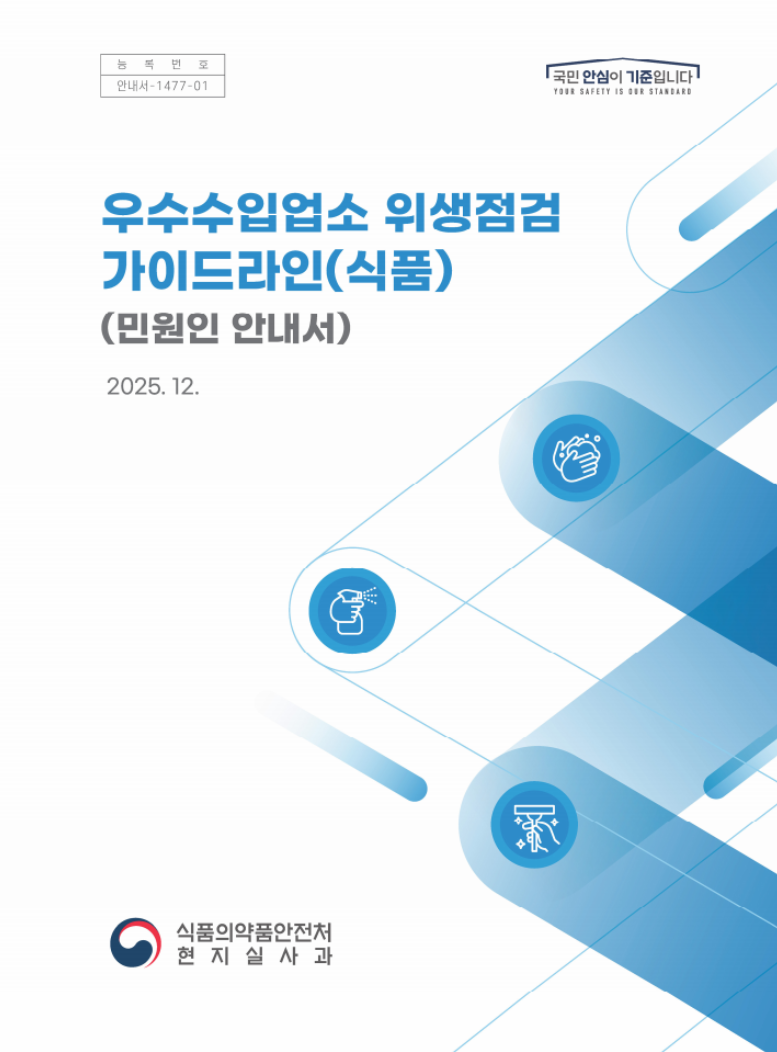 식품의약품안전처에서는 우수수입업소 등록 제도 개요 및 절차, 등록 후 준수사항과 우대혜택, 해외제조업소 위생점검 기준 등 우수수입업소 등록을 준비 중인 수입영업자 등에게 도움을 주고자 「우수수입업소(식품분야) 위생점검 가이드라인」을 제정하였습니다. 이에 안내드리오니 관련 업무에 참고하시기 바랍니다.