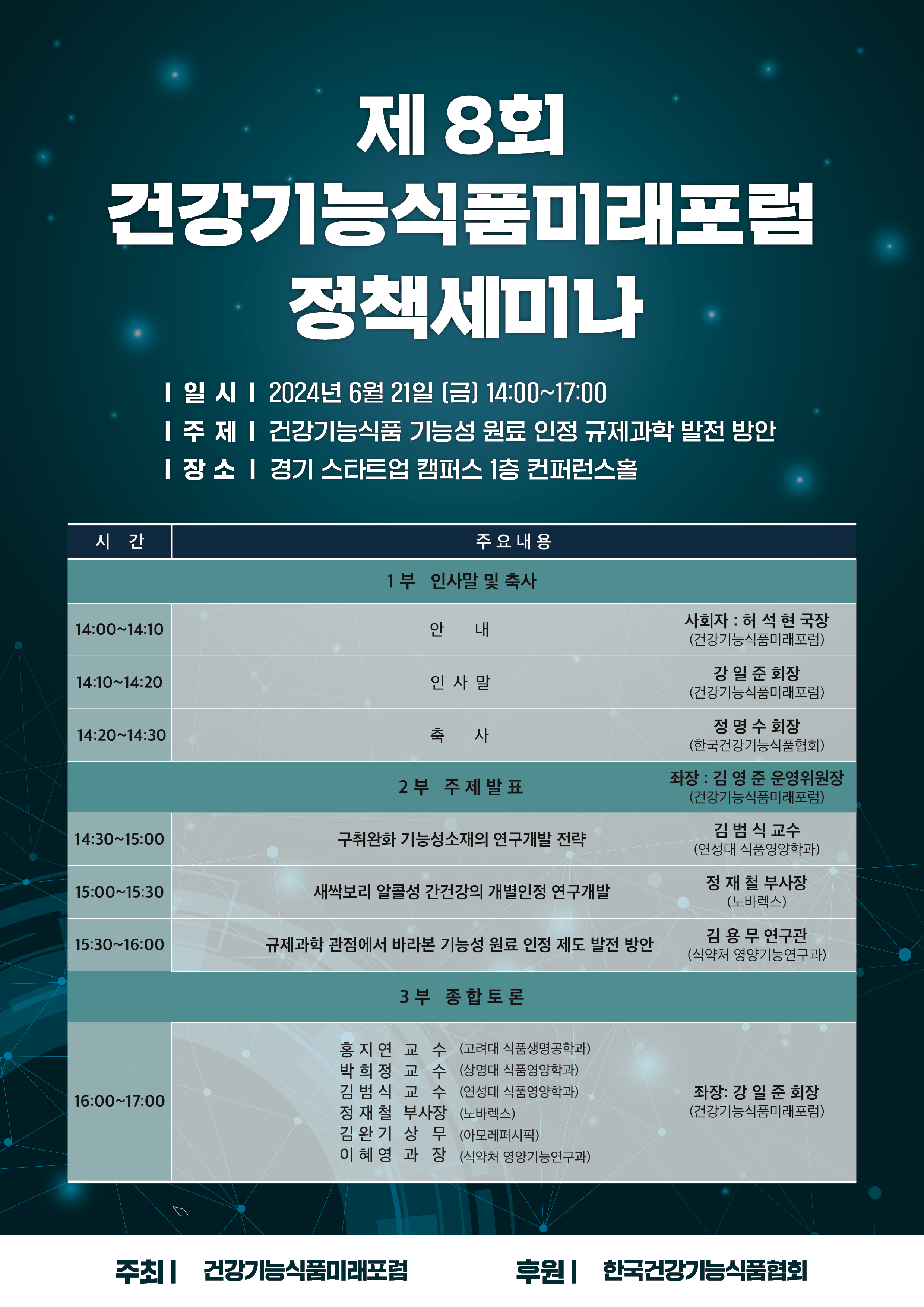 ○ 일 시 : 2024. 6. 21 (금) 14:00 ~ 17:00 ○ 장 소 : 경기 스타트업캠퍼스 1층 컨퍼런스홀 (선착순 200명) / 유튜브 온라인 생중계 ○ 주 최 : 건강기능식품미래포럼 ○ 후 원 : 한국건강기능식품협회 ○ 프로그램