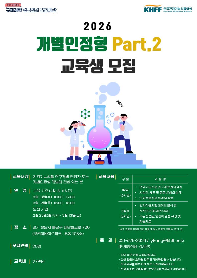 우리 협회에서는 건강기능식품 산업계의 인재양성을 위한「2026 개별인정형 Part.2」을 개설하여 다음과 같이 교육생을 모집하오니 많은 관심 및 신청 바랍니다.