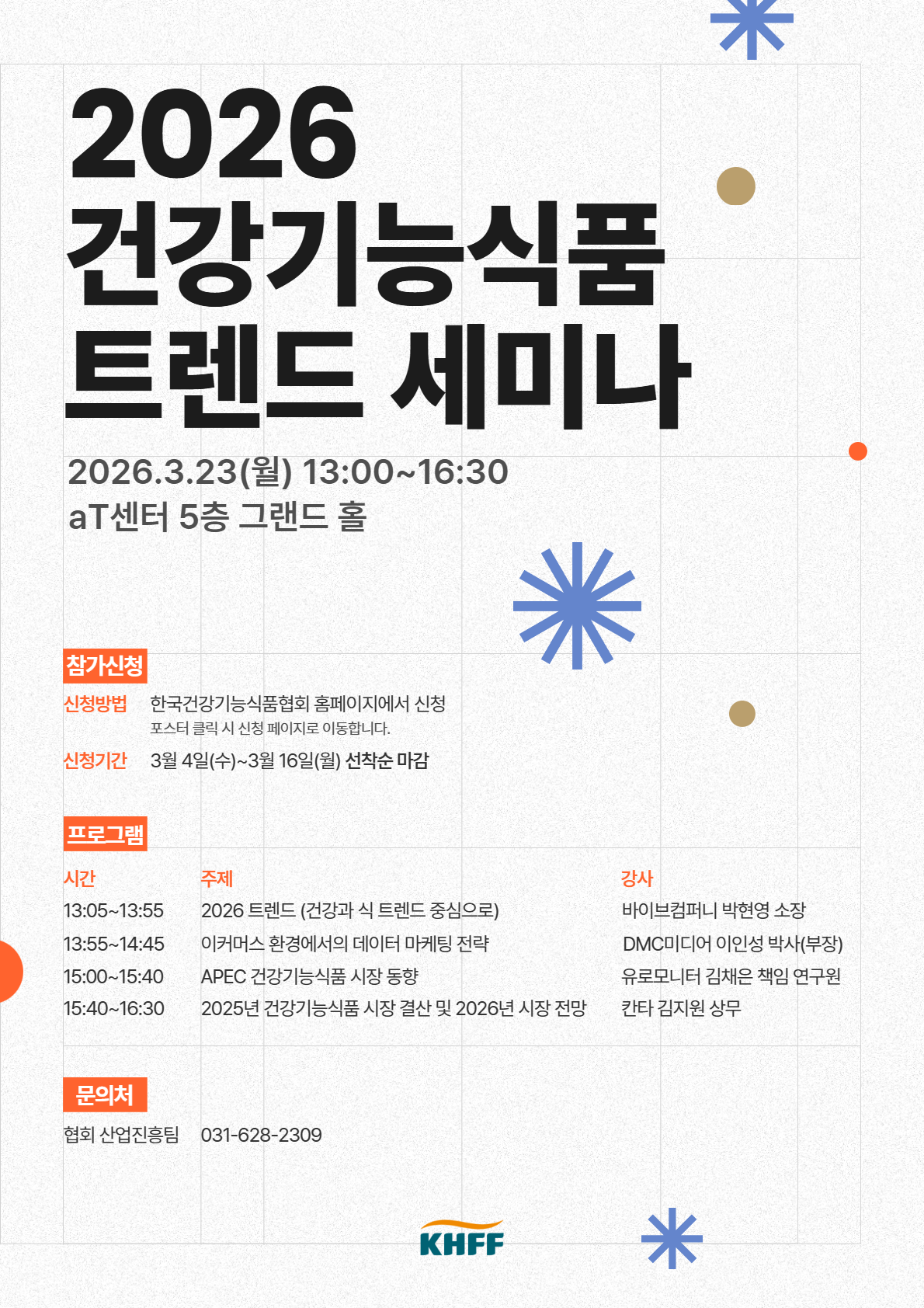 2026 건강기능식품 트렌드 세미나 개최 우리 협회는 건강기능식품 시장 전망 및 유통·마케팅 정보를 제공하는 「2026 건강기능식품 트렌드 세미나」 를 개최할 예정입니다. 이번 세미나는 마케팅 전략 수립 등에 도움이 되는 좋은 기회가 될 것입니다. 회원사 여러분의 많은 신청 바랍니다. ❍ 일 시 : 2026년 3월 23일(월) 13:00~16:30 ❍ 장 소 : aT센터 5층 그랜드 홀 ❍ 대 상 : 회원사 홍보·마케팅 실무자 ※ 회원사당 4명 무료 / 비회원사 유료 (1인 5만원) ❍ 프로그램 일 정 | 내 용 | 비 고 | 13:00~13:05 | 5‘ | 개회사 | 협회 | 13:05~13:55 | 50‘ | 2026 트렌드 (건강과 식 트렌드 중심으로) | 바이브컴퍼니 박현영 소장 | 13:55~14:45 | 50‘ | 이커머스 환경에서의 데이터 마케팅 전략 | DMC미디어 이인성 박사(부장) | 14:45~15:00 | 15‘ | Break Time | 15:00~15:40 | 40‘ | APEC 건강기능식품 시장 동향 | 유로모니터 김채은 책임 연구원 | 15:40~16:30 | 50‘ | 2025년 건강기능식품 시장 결산 및 2026년 시장 전망 | 칸타 김지원 상무 |
