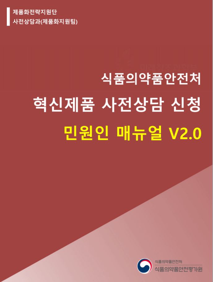 식품의약품안전처에서 「식품·의약품 등의 안전 및 제품화 지원에 관한 규제과학혁신법」 제13조 및 「식품·의약품 등 혁신제품 제품화 검토 운영 규정」에 따라, 혁신제품 사전상담의 접근성·편의성 향상을 위해 신청 시스템을 개편하였습니다. 이에 따라 혁신제품 사전상담 민원 신청 시 전자민원시스템 활용을 위한 상세 매뉴얼을 업데이트하여 안내드리오니, 업무에 참고하시기 바랍니다.