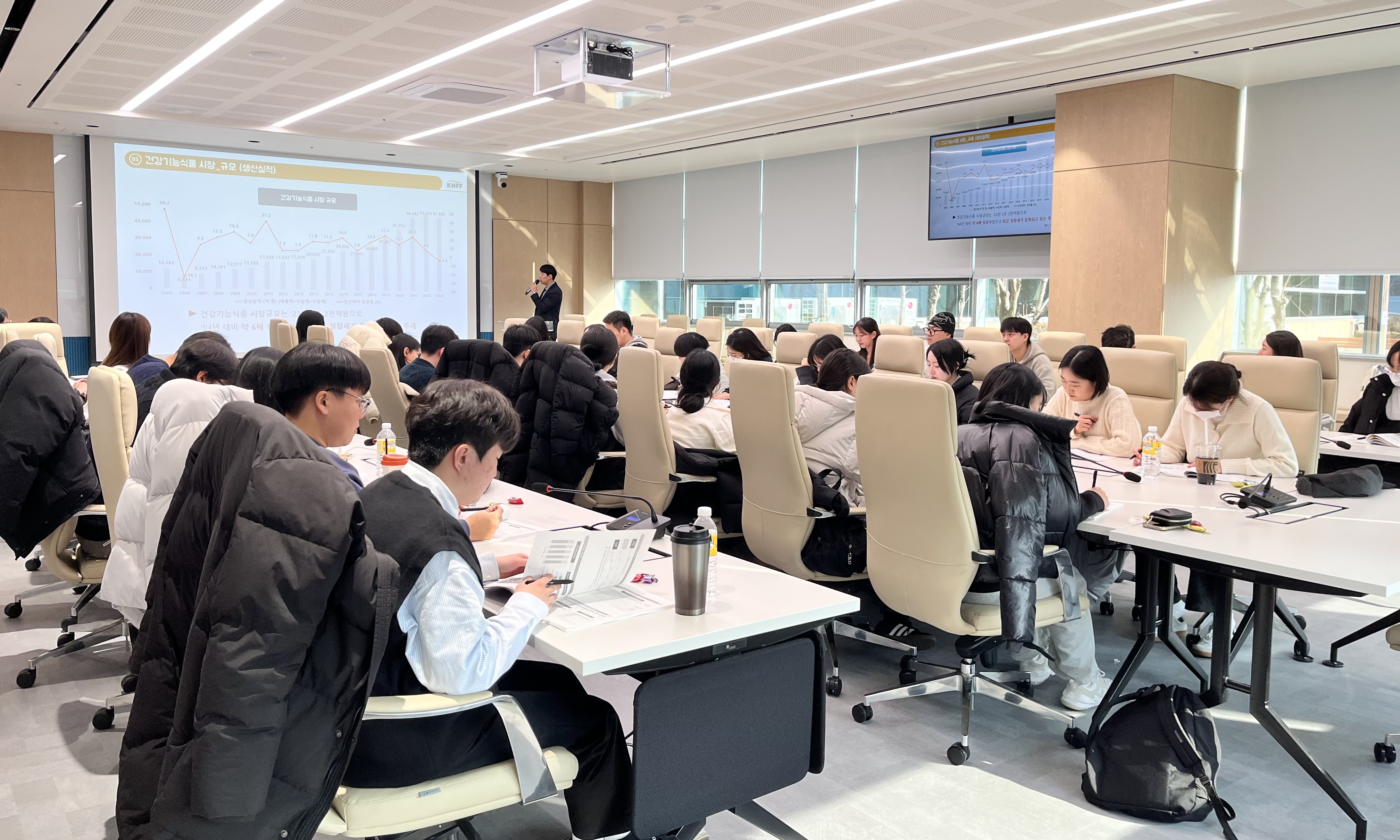 ○일 자 : 2025년 1월 22일 (수) (1일 과정) ○장 소 : 한국건강기능식품협회 대회의실 ○참석자 : 식품공학/식품영양학 등 식품 관련 전공 대학생 31명 (경희대학교 외 7개 대학) ○내 용 : 협회는 건강기능식품 산업의 흐름을 파악하고, 건강기능식품 업계의 다양한 업무 이해를 돕기 위해 개설한 '1월 건강기능식품 예비 종사자 실무 교육’을 진행했다. 진행된 교육은 건강기능식품 법률 개론 및 산업의 이해, 건강기능식품 공전 및 실험, 건강기능식품 자율광고심의 등으로 구성되어 있다. 또한 본 협회 소개 및 업계 선배님과의 멘토링을 통해 학생들에게 도움을 주는 시간을 마련하였다.