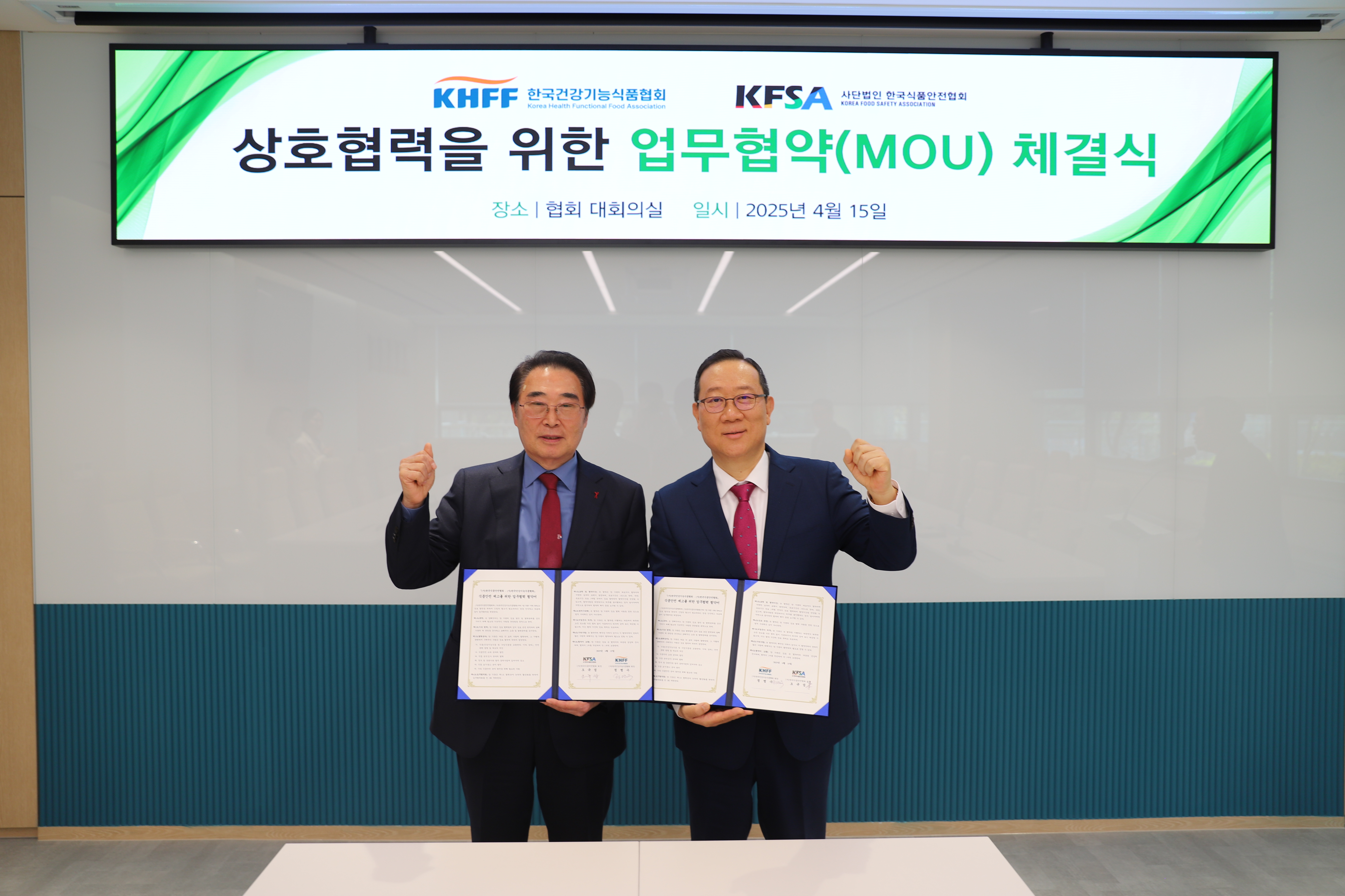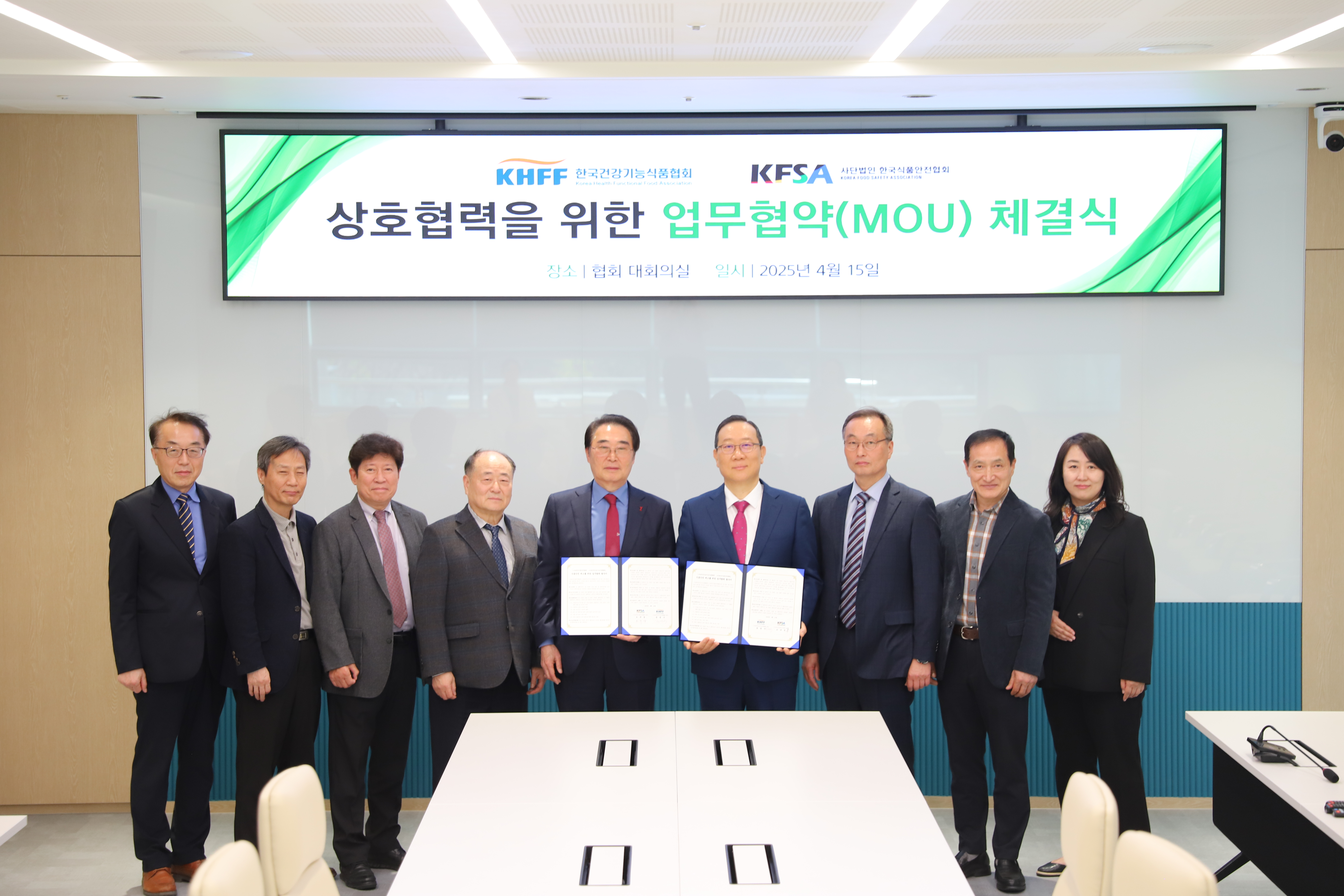 ○ 일 자 : 2025년 4월 15일(화) ○ 장 소 : (사)한국건강기능식품협회 대회의실 ○ 참석자 - (한국식품안전협회) 오규섭 회장, 황성휘 부회장, 전종민 상근부회장, 홍영표 이사, 김시필 사무총장 - (한국건강기능식품협회) 정명수 회장, 이종원 부회장, 신재식 전무, 하혜진 사무처장, 최재호 부장 ○ 내 용 : 협회는 15일 (사)한국식품안전협회와 건강기능식품을 포함한 식품 안전을 강화하고 국민 건강 증진 및 지속가능한 발전을 위한 업무협약을 체결하였다. 이번 협약을 통해 △식품안전 관련 법령 및 제도 개선 △식품안전 교육 분야의 발전 △식품 분석·검사 분야 협력 △정부 및 유관기관 발주 용역사업에 있어서의 공조 △식품 표시·광고 분야 발전 △기타 식품안전 분야 발전을 위한 상호 협력 체계를 구축하고 공동 노력해 나갈 예정이다. 특히 양 협회는 전문성과 경험을 공유하며, 식품 안전성 향상과 관련 산업의 지속 가능한 성장을 도모할 계획이다.